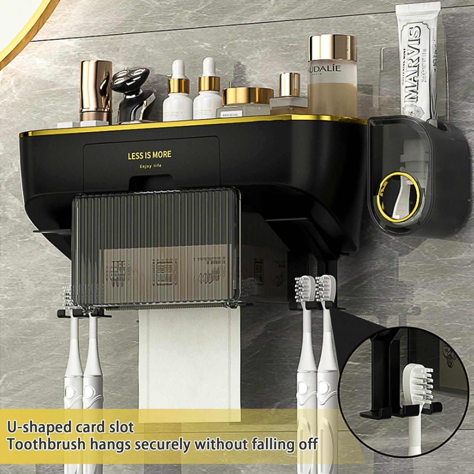 【Tissue Holder Design】 This toothbrush holder for bathrooms is equipped with a tissue box that can hold tissue paper, roll paper and face towels. One design meets your multiple needs and is very suitable for daily use.