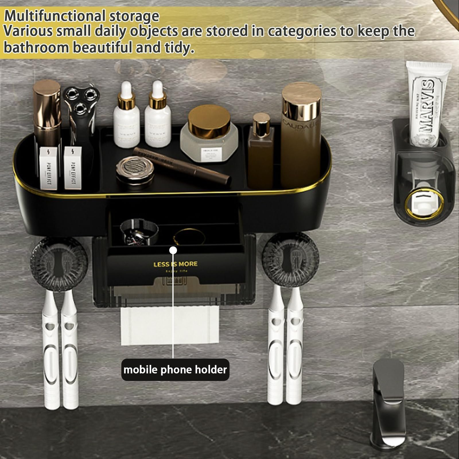 【Innovative Design】This bathroom toothbrush holder set comes with 1 automatic toothpaste squeezer, 1 paper towel holder, 2 cups, 4 toothbrush slots, 1 storage drawer and 3 storage compartments. You can place razors, combs, skin care products, cosmetics, facial cleansers and other items on it.